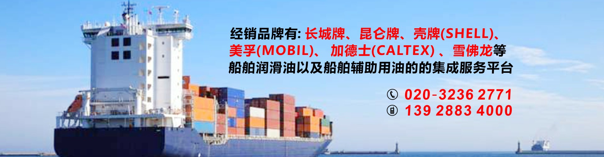 公司代理中石化長城潤滑油以及中石化國際品牌SINOPEC潤滑油,經銷品牌有昆侖牌、殼牌(SHELL)美孚(MOBIL)、加德士(CALTEX)、雪佛龍(CHEVRON)是船舶潤滑油以及船舶輔助用油的的集成服務平臺,也可按照船東要求提供船舶消防救生用品、勞保用品、五金燈具及甲板用品等船舶配套產品。